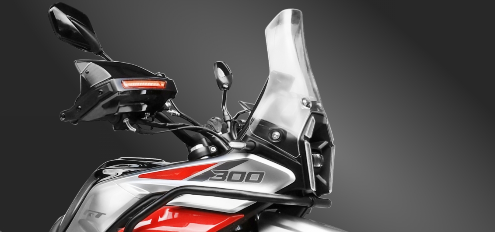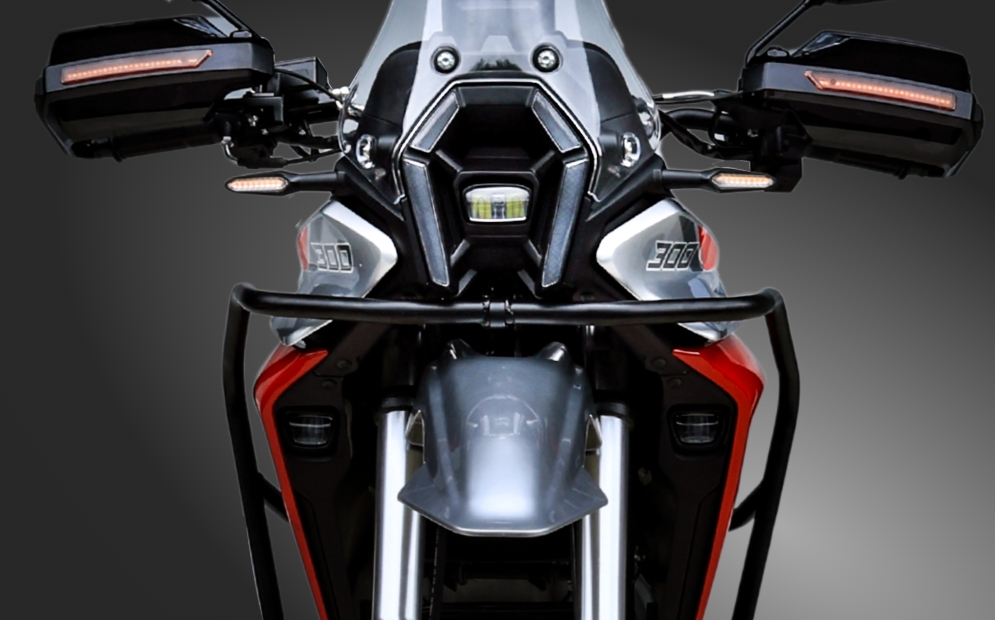 A fierce and unique beauty machine Max. Power 18.5kW(24.8hp)/7500rpm Max. Torque 24N.m/6500rpm Max. Speed 130km/h Suspension Design Classic front-end design with a bold adventurous look High windshield design, effectively reducing wind resistance during long rides The spacious fuel tank (16L) is in harmony with the large seat design, giving the overall appearance a solid and reliable feel. Sword-shaped LED headlights, providing clear illumination for night riding Family-style X-shaped taillights, with high recognition even at long distances Hidden handle decorative lamp, personalized decoration, simple and neat. LED vertical display screen, unique design, clear and eye-catching driving information Core Configurations BA280 engine, sufficient torque at low RPM, better control in complex road conditions Lightweight patented frame, supreme control, and no fatigue even after long rides. 210mm ground clearance, easily handling and unpaved roads All-terrain 17-inch large tires, allowing for easy switching between urban and off-road conditions The large-sized handle guard effectively protects against wind and air currents, enhancing comfort during long journeys. Half-enclosed personalized anti-collision bar, providing precise protection for the core parts of the motorcycle. Supports three-box system, meeting the needs of long-distance travel Standardized headlights, suitable for safe riding in various scenarios ADV300 Parameters Engine NameBA280 Displacement(ml)278.3 Max.Power (kW/rpm)18.5(24.8hp)/7500 Max.Torque (N.m/rpm)24/6500 Max.Speed(km/h)130 BorexStroke(mm)75x63 Compression Ratio9.6:1 Ignition ModeCDI Fuel Tank Capacity(L)16 Gear6-Speed Gearshift Transmission ModeChain Drive Start ModeElectric Front Tires110/90-17 Rear Tires130/80-17 Front BrakeDisc Brake Rear BrakeDisc Brake Dry Weight (kg)134 Fuel Consumption(L/100km)3.8 Min.Ground Clearance(mm)210 Product Dimensions(mm)2080x930x1381 Seat Hight(mm)810 Wheelbase(mm)1376 Loading Capacity(kg)150 Climbing Ability(°)30° Min. Turning Radius(mm)2601