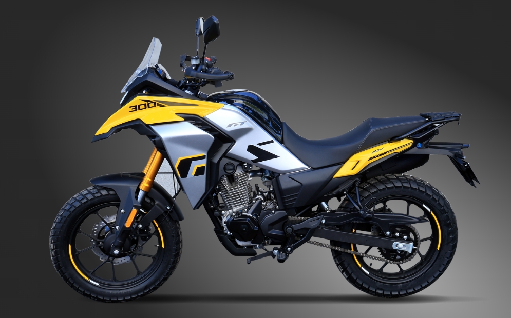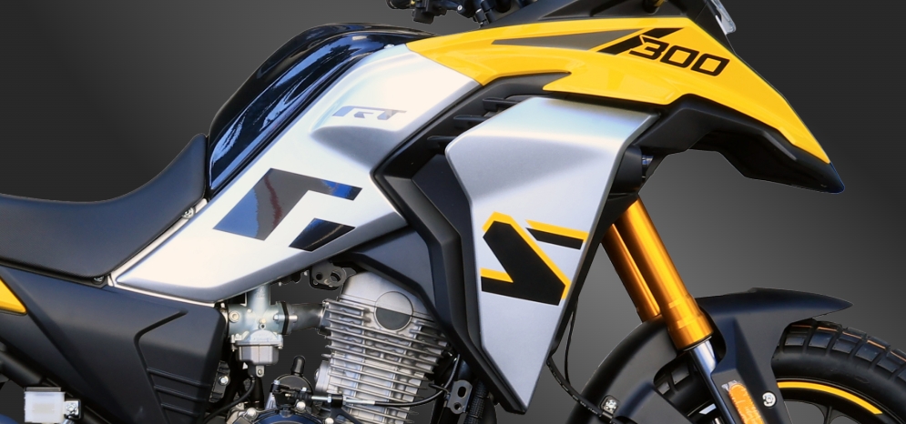 A fierce and unique beauty machine Max. Power 18.5kW(24.8hp)/7500rpm Max. Torque 24N.m/6500rpm Max. Speed 130km/h Classic GS Design Classic GS style, with a bird beak-shaped front air intake and a small windshield, the lines are more slender and the style is more modern Geometric cutting design of the side guard plates for the fuel tank, enhancing the sense of movement Family-style X-shaped matrix headlights, high recognition on the front Family-style X-shaped taillights, unified overall style LED display instrument, with clear reading of riding information Core Configurations BA280 engine, stable low-torque output, suitable for long-distance riding. Lightweight patent frame, easy to control. 210mm high ground clearance design, more in dealing with complex road conditions. 16L large fuel tank, reduces refueling frequency during long-distance riding. All-terrain 17-inch large tires, allowing for easy switching between urban and off-road conditions Personalized handle decorative lamp, enhancing the overall vehicle quality Split-tier step-through seats, balancing control and passenger comfort. High-position exhaust to improve passability, optimizing center of gravity distribution, and making the control more stable. ADV300-GS Parameters Engine NameBA280 Displacement(ml)278.3 Max.Power (kW/rpm)18.5(24.8hp)/7500 Max.Torque (N.m/rpm)24/6500 Max.Speed(km/h)130 BorexStroke(mm)75x63 Compression Ratio9.6:1 Ignition ModeCDI Fuel Tank Capacity(L)16 Gear6-Speed Gearshift Transmission ModeChain Drive Start ModeElectric Front Tires110/90-17 Rear Tires130/80-17 Front BrakeDisc Brake Rear BrakeDisc Brake Dry Weight (kg)134 Fuel Consumption(L/100km)3.8 Min.Ground Clearance(mm)210 Product Dimensions(mm)2080x930x1381 Seat Hight(mm)810 Wheelbase(mm)1376 Loading Capacity(kg)150 Climbing Ability(°)30° Min. Turning Radius(mm)2601